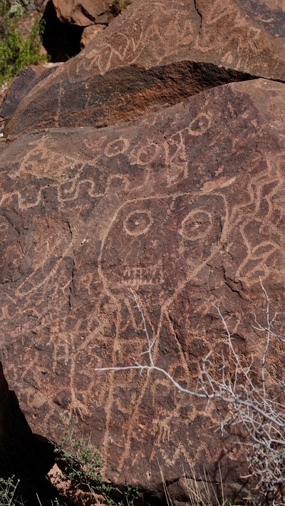 The Providence Cone site is in the lava fields east of Deming; Cañada Alamosa is northwest of Monticello at the north end of the Black Range; the Petroglyph Mine site is about two miles east of Hillsboro; Dragonfly Trail is east of Silver City (off of US-180); Pony Hills and Frying Pan Canyon are the most significant sites in this area - China Draw and McGee Canyon are nearby; a site east of Radium Springs is shown in the first two photographs below; the Tonuco Mountain site is up a beautiful desert mountain canyon; and the site at Valles Canyon - Sierra de las Uvas requires a walk down a beautiful wash.