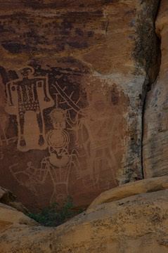 The many petroglyph panels at this site are etched or drawn (there are both petroglyphs and pictographs) on the tall cliffs of Navajo Formation sandstone. The Three Kings Panel (pictured below) is about nine feet tall and is located high on the cliff face. There are many other large glyphs at this site as well as an array of smaller ones.